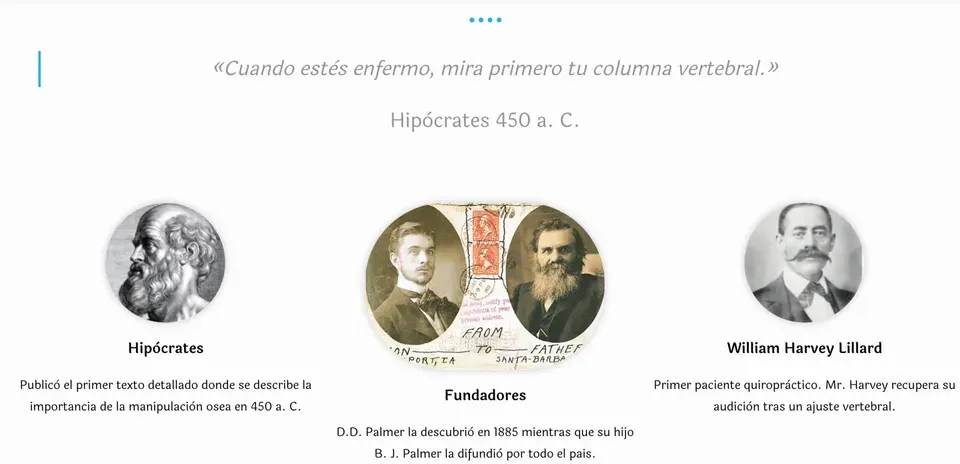 Nace en 1895 aunque la utilización de la manipulación articular tiene miles de años de historia, siendo Hipócrates el primero en describirla. Una de sus frases celebres nos dice -«Cuando estés enfermo, mira primero tu columna vertebral.» Fué a finales del siglo XIX cuando D.D. Palmer descubre la quiropráctica en Davenport, Ioha, Estados Unidos. Realizó con éxito el primer ajuste vertebral quiropráctico, corrigiendo el desplazamiento de una vértebra a Harvey Lillard, el primer paciente quiropráctico. Mr. Harvey recupero su audición que había perdido tras sufrir un accidente.